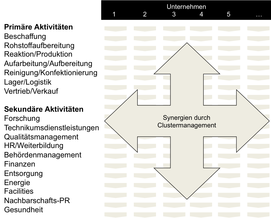 Der rhein-main-cluster chemie & pharma dient als neutrale Kommunikationsplattform, auf der die Akteure sich vernetzen und ihre Interessen vertreten können. In dem Cluster werden Aktivitäten durchgeführt, die Synergien erzeugen und den Unternehmen einen Nutzen stiften. Die Priorisierung der Aktivitäten erfolgt anhand der unternehmerischen Wertschöpfungsketten in ihren Verflechtungen. Hierbei wird zwischen den primären Aktivitäten der Unternehmen einerseits und den sekundären Aktivitäten andererseits unterschieden.